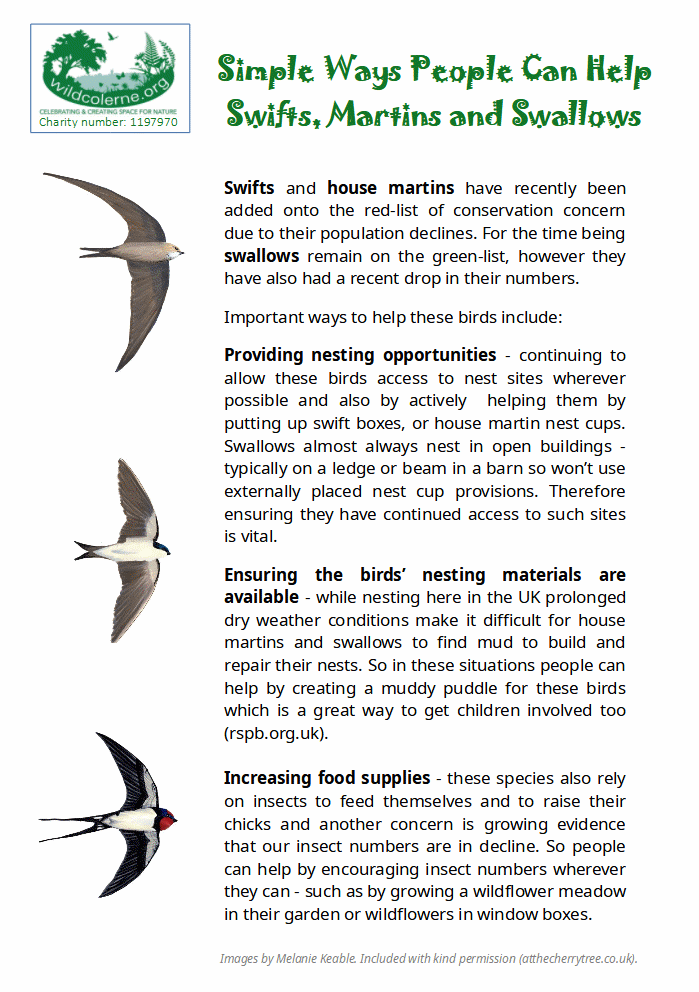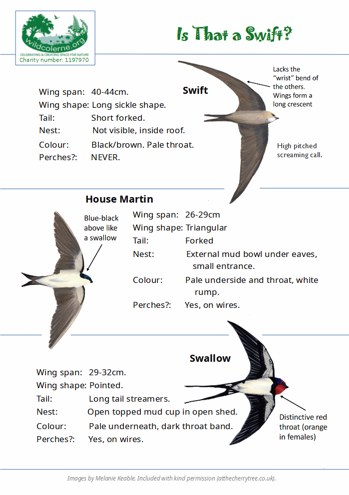 Wild Colerne information leaflets on swifts: how to ID a swift, and how you can help swifts | |